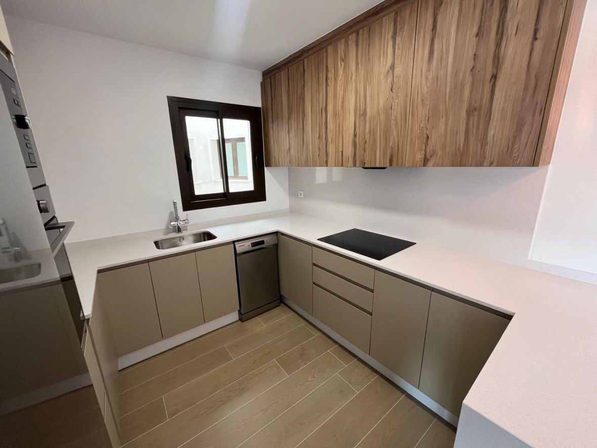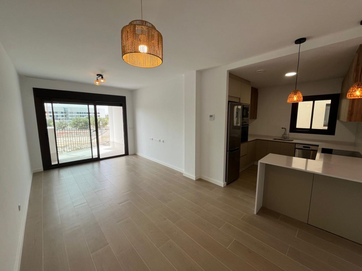 Consta de un amplio salón con cocina americana, completamente equipada con horno, lavavajillas, vitro de inducción, microondas y nevera. Amplio salón que da a una terraza de unos 6 metros, con espacio suficiente para mesa y sillas y así poder disfrutar de ella. La vivienda se alquila sin amueblar.